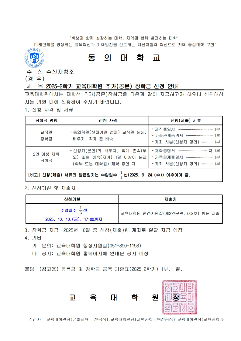 2025학년도 2학기 교육대학원 추가(공문) 장학금 신청 안내