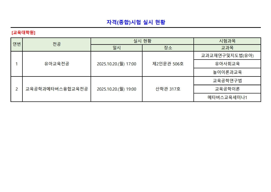 교육대학원에서는 2025-2학기 자격(종합)시험 실시 일정을 아래와 같이 안내하오니 해당 학생들은 실시 현황에 맞춰서 시험에 응시하시기 바랍니다. 자세한 사항은 각 전공사무실로 문의하시기 바랍니다.